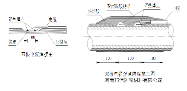 ⑦電纜與管道連接、電纜與帶狀陽(yáng)極的連接均采用鋁熱焊,應(yīng)對(duì)連接處的防腐進(jìn)行檢查。